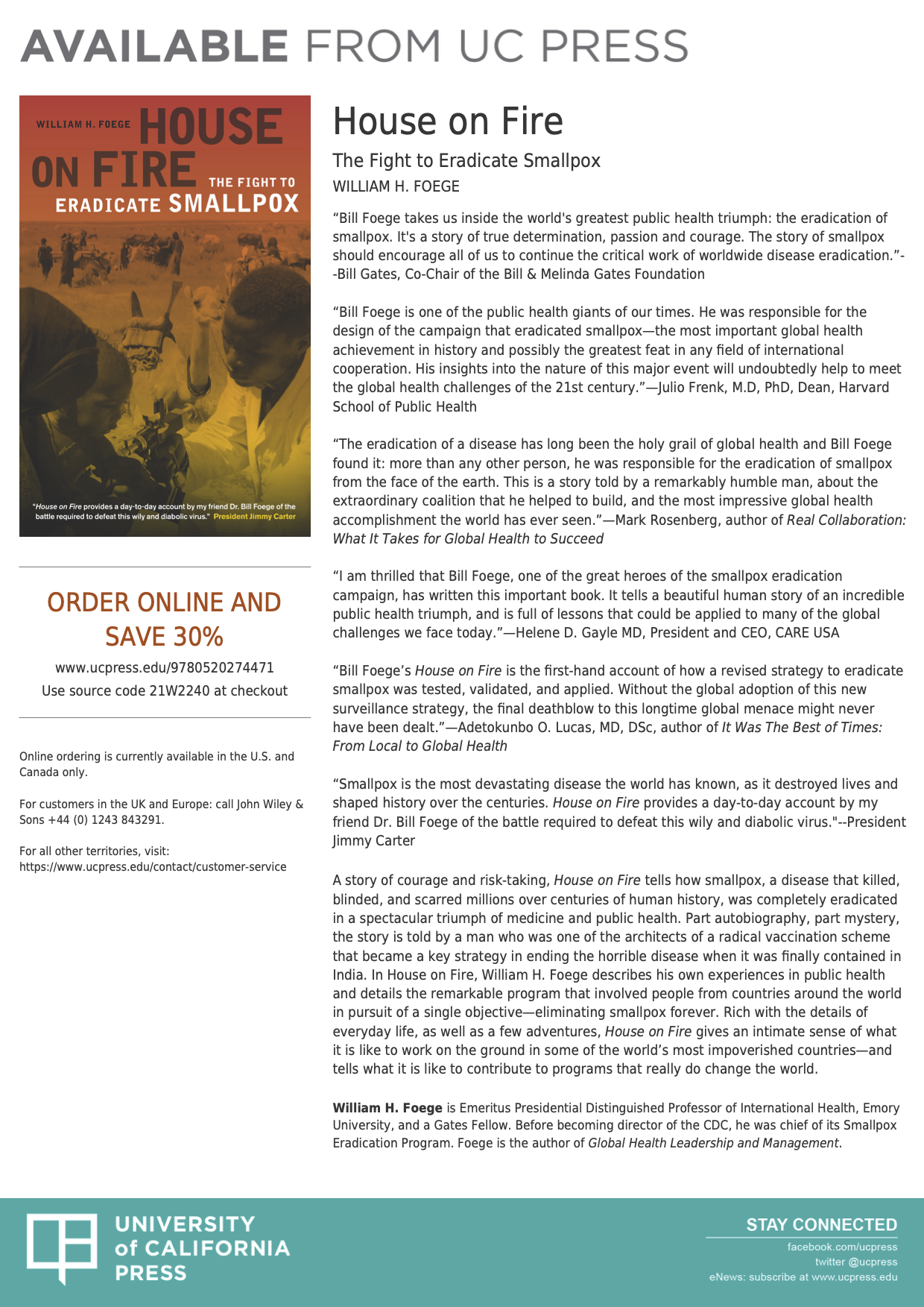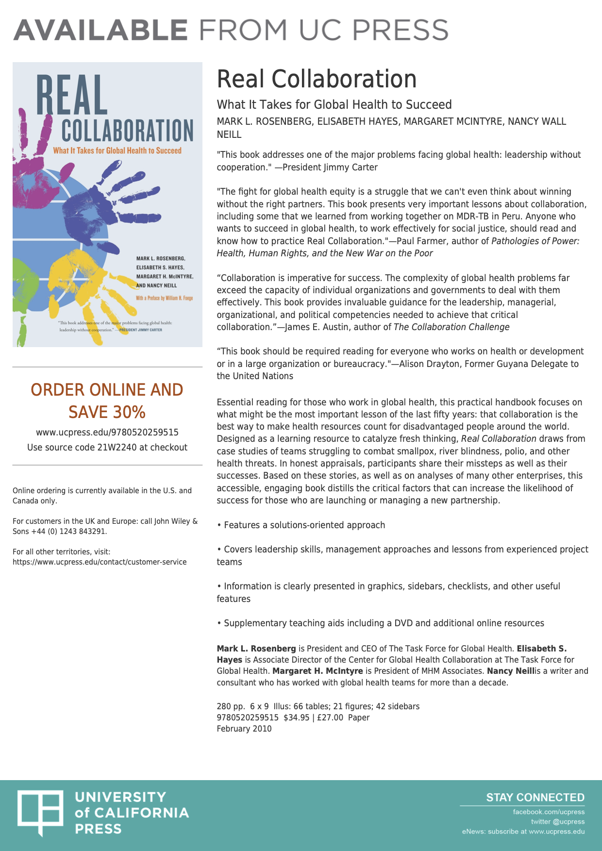 Because you’ve joined us at some of our many events around Becoming Better Ancestors, University of California Press is offering a special 30% discount on titles from the project team including Bill Foege’s House on Fire and Mark Rosenberg and Lisa Hayes’ Real Collaboration.